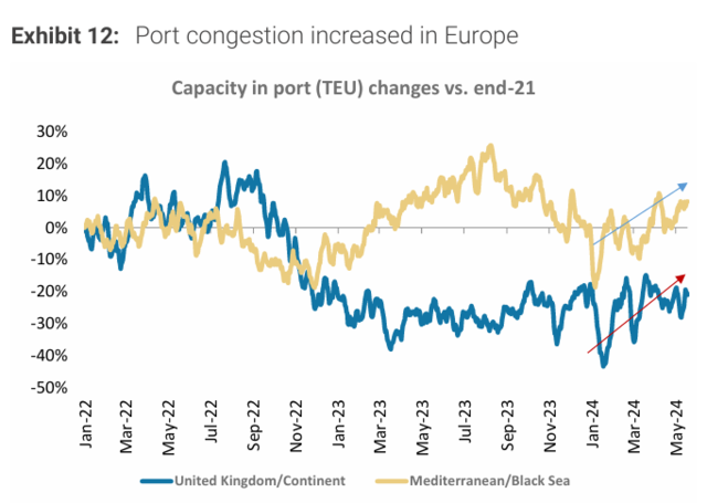这种重新安排航线的做法影响了全球约 30%的集装箱贸易,导致相关航线的运输距离延长了约 30%。也就是说,如果红海干扰持续下去,将额外消耗全球集装箱运输能力的 9-10%。