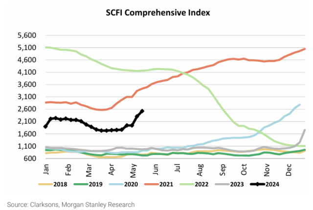 大摩在24日的一份报告中指出,受红海危机干扰航运市场运力,导致欧洲航线的运力短缺,叠加新交付的船舶不能完全弥补运力短缺,航运价格在飙升。